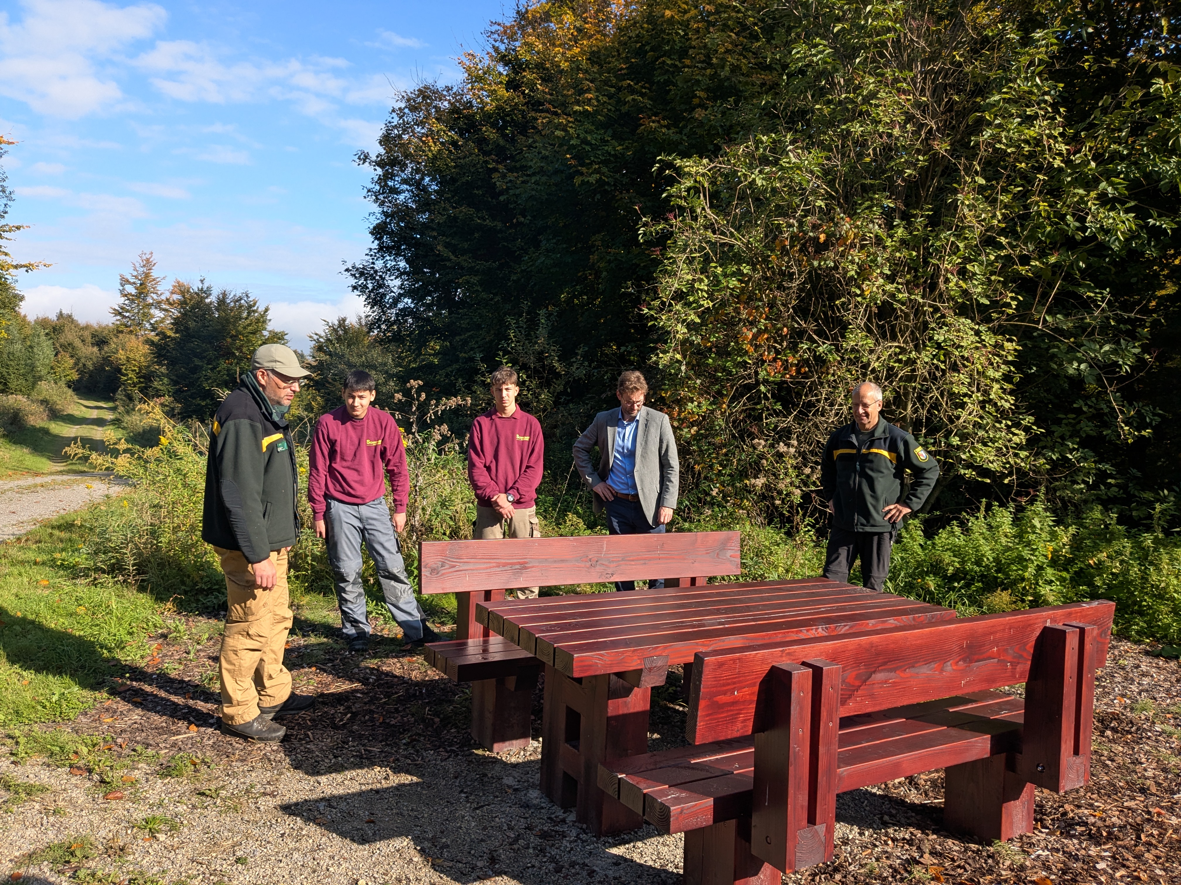 Zur offiziellen Besichtigung der neuen Sitzgelegenheit im Wald trafen sich Vertreter des Stadtbauamts und der Forstabteilung – darunter der Abteilungsleiter des Stadtbauamts/Forstabteilung Joachim Lauinger, der Forstrevierleiter „Hardtwald“ Stefan Lenhard Strobel, sowie Bürgermeister Moritz Heidecker. Auch zwei Auszubildende unserer Schreinerei waren anwesend, einer davon war maßgeblich an der Fertigung der Garnitur beteiligt.